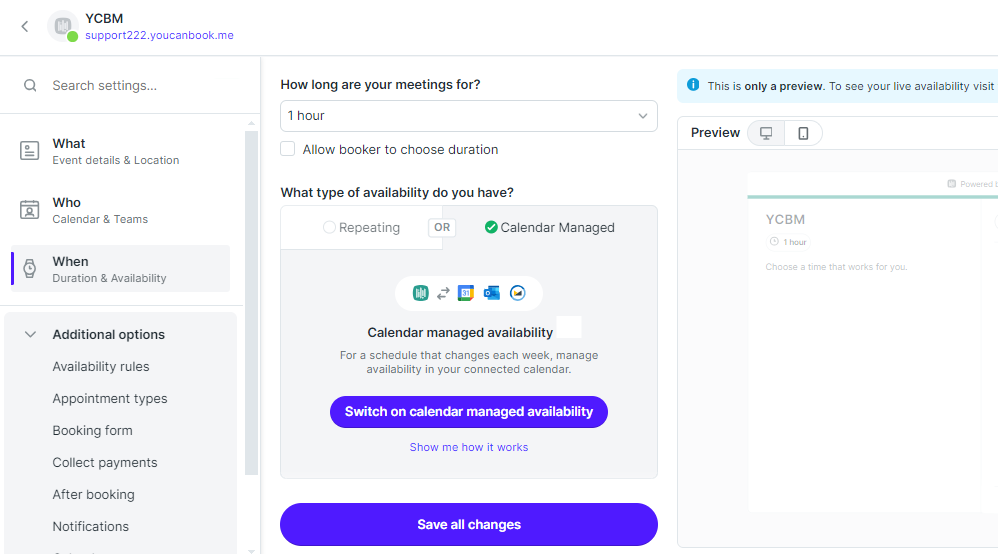 Calendar Managed Availability gives you the flexibility to change the times you offer for booking from week to week or limit the times YouCanBookMe will display for booking on a booking page.