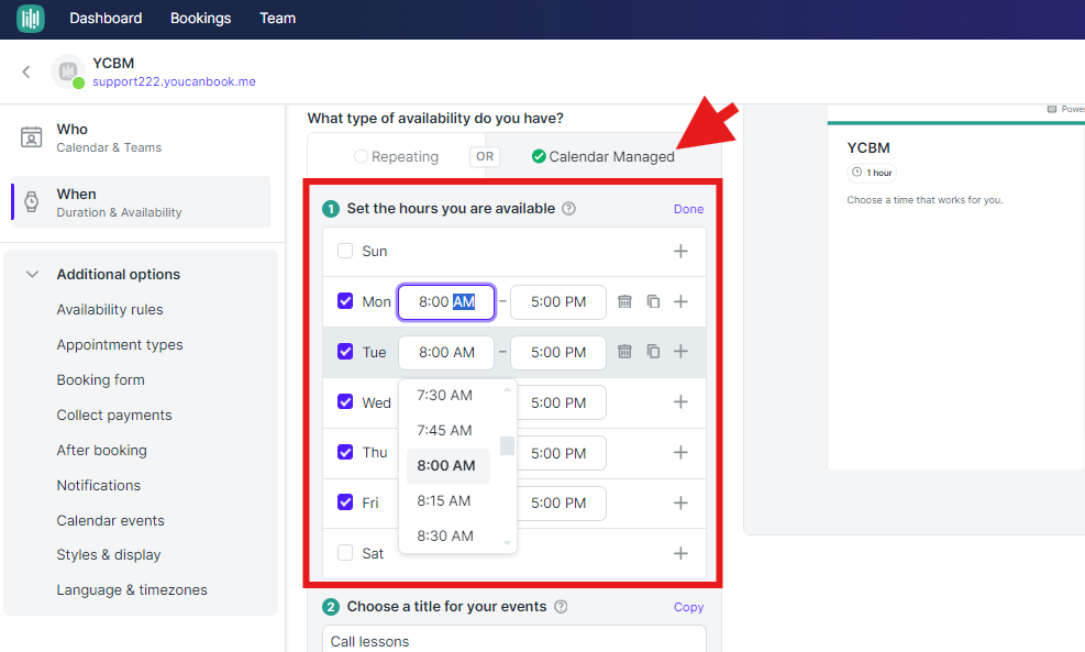 1. Under "When" select Calendar Managed Availability and you'll set standard work hours for each day, unchecking any day you'll never offer a time slot for booking. Set the widest range of working hours you might take a booking.