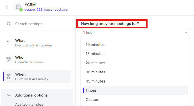 3. Under When: Duration & Availability, adjust your meeting duration.