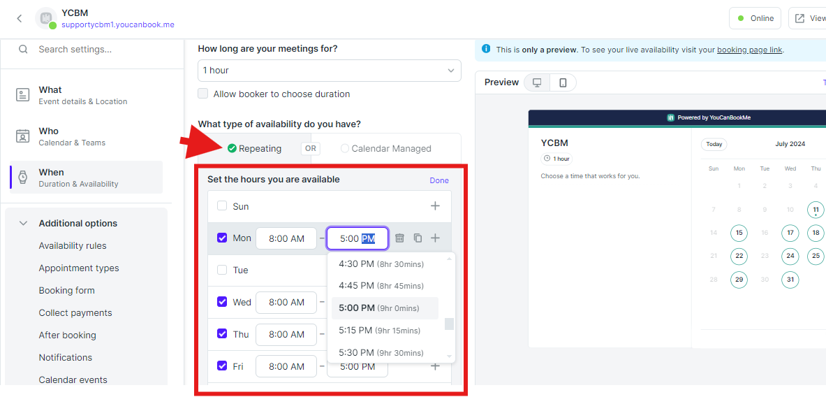 1. Under "When" select Repeating Availability and you'll set standard work hours for each day, unchecking any day you'll never offer a time slot for booking. These set days/hours will be applied to your booking page week by week. YouCanBookMe will scan your linked calendar during your set work hours and display any time for booking where we don't find a conflicting event.