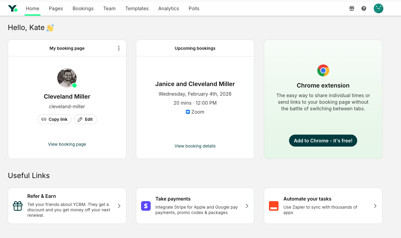 Your Dashboard is the center of your YouCanBook.me account. Once logged into your account, your Dashboard will show you all of your booking pages, help you access any bookings you've received, and manage your Account settings. This feature is available on All plans.