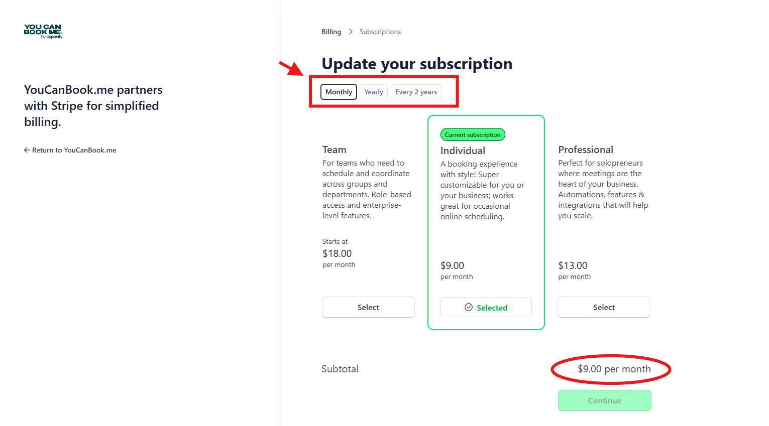 On the following page, you can customize your billing cycle at the top by selecting your preferred subscription frequency: Monthly, Yearly, or 2-Year. As you make your selection, please refer to the bottom of the screen to view your updated subtotal in real-time.