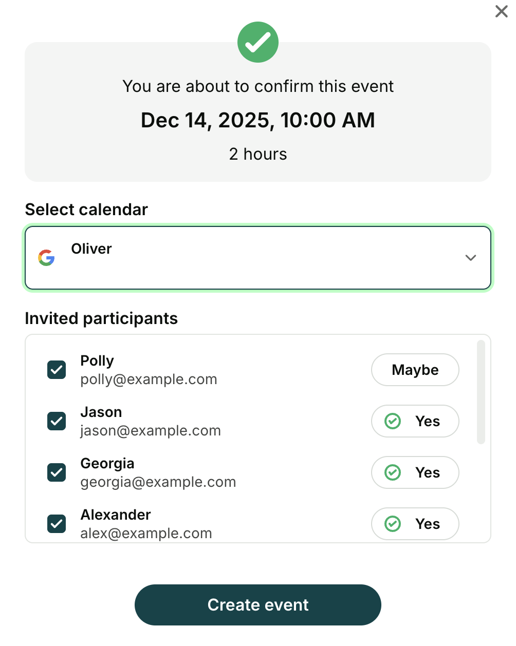 When you finalize the poll by confirming the date & time, you will see everyone who responded and what they selected. You will decide which calendar to add the event to, and you can remove anyone that you do not want to add. Just unselect the box next to their name.